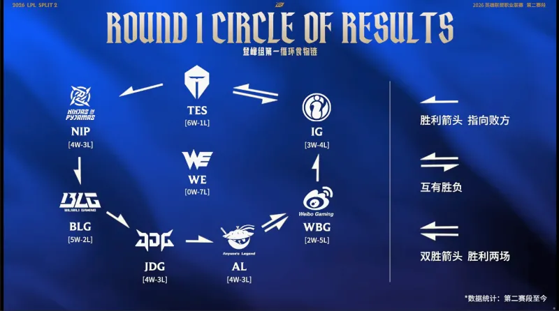 虎扑04月26日讯 1.在今天BLG对阵WBG的比赛开始之前,官方给出了登峰组第二赛段截至目前的胜负情况图,其中登峰组各队形成胜负闭环,仅WE未尝一胜