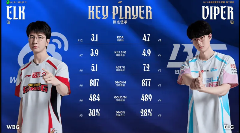 2.图二为BLG与WBG的射手位选手的数据对比,其中Viper整体数据占优